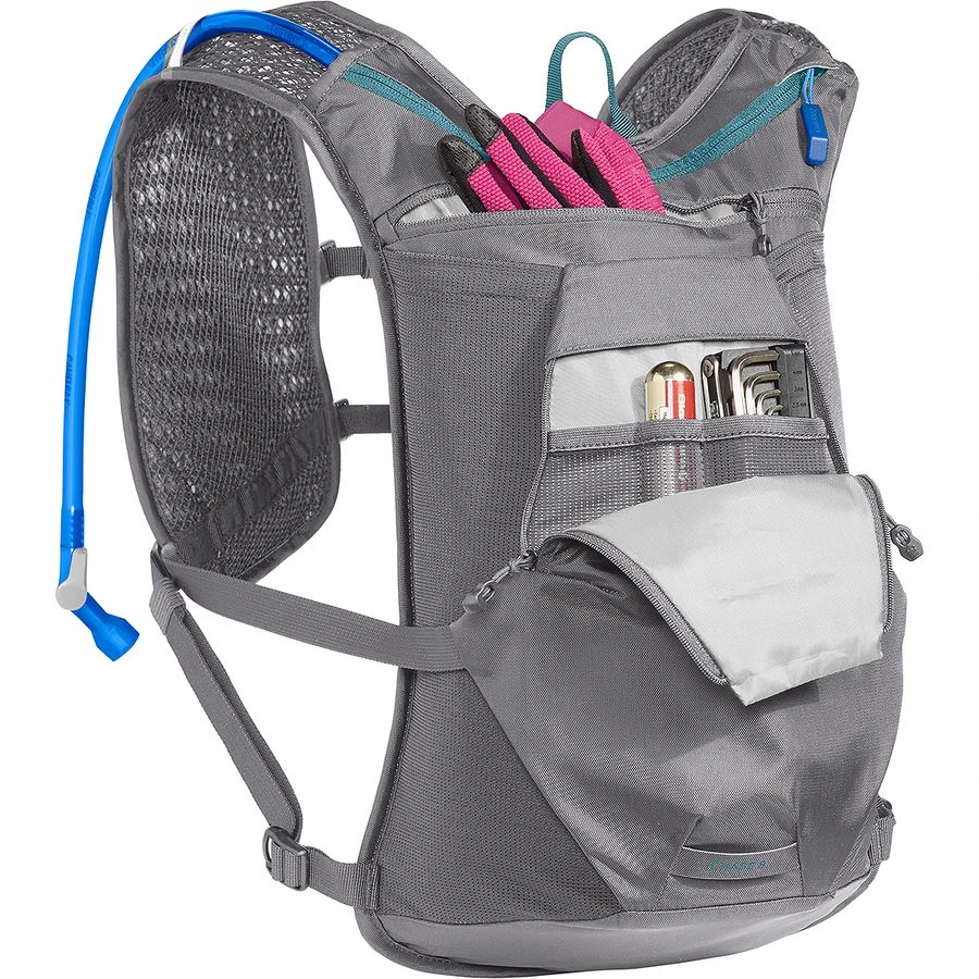 Hydration and organization for a full day’s ride. The lightweight Chase™ 8 Vest packs 2-liters of hydration in the Crux™ reservoir with Quicklink™, and features 6 more liters of strategic stow options for gear, phone, fuel, and more. Small details like secure zip pockets, an integrated tool roll, reflectivity, portable pump loop, and stretch overflow pocket make a big difference. 3D vent mesh allows for cooling air flow. Sits above jersey pockets.