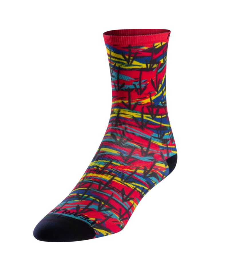 You’ve never worn a sock like this. We begin with our Repreve® recycled yarn and rather than weave in the graphics, we 3D-print them to reduce bulk while maintaining solid color penetration throughout the sock, so that the colors don’t fade when the sock is stretched. Next, we give the socks our PI Dry® treatment, which not only keeps your feet drier on a damp day, it also means that white socks are highly stain-resistant. This might be the highest-tech sock on the market. Our “tall” sock reaches to the bottom of the calf for most riders.